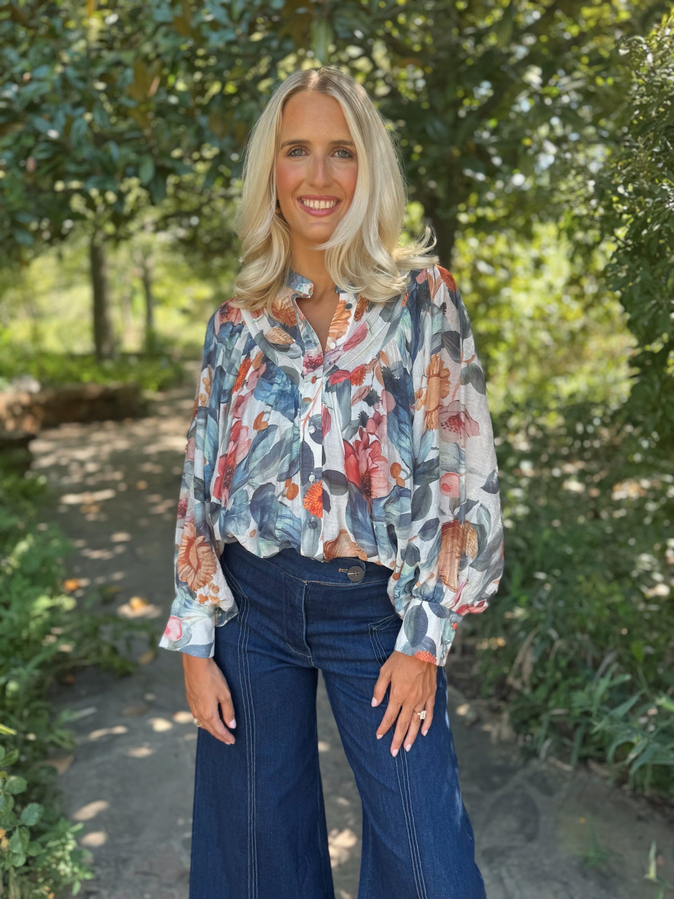 Experience the effortless style of our Multi Floral Blouse. This stunning button down blouse showcases a beautiful array of colors and features adjustable cuff buttons on the sleeves. Perfect for any occasion, add a touch of elegance to your wardrobe with this versatile piece.