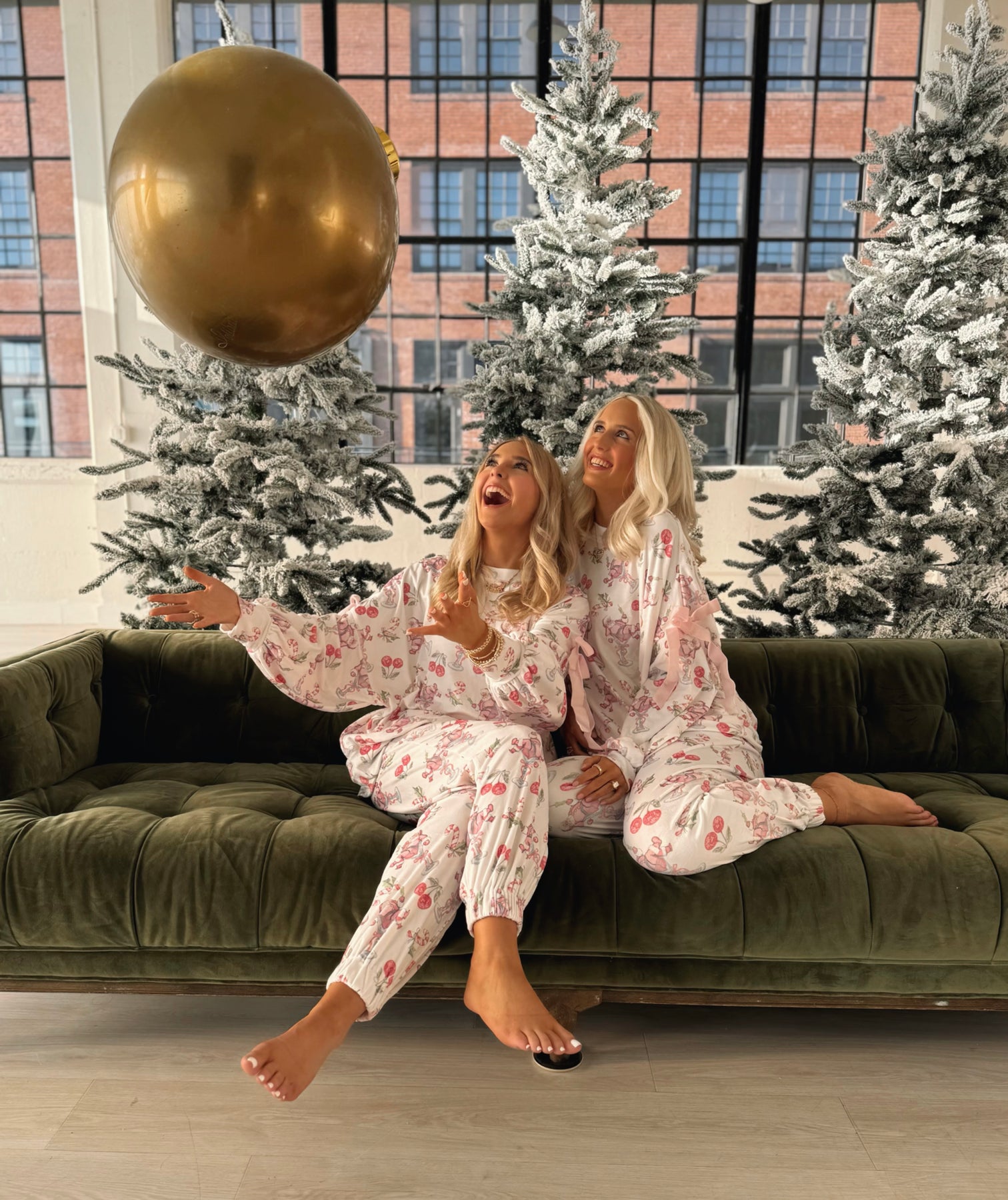 Get into the holiday spirit with our Santa Martini Glass Pajamas. The adorable Santa print adds a festive touch, while the soft fabric ensures ultimate comfort. The jogger pants and velvet bow detailing on the sleeves elevate the cozy factor. Perfect for a cozy and stylish Christmas!