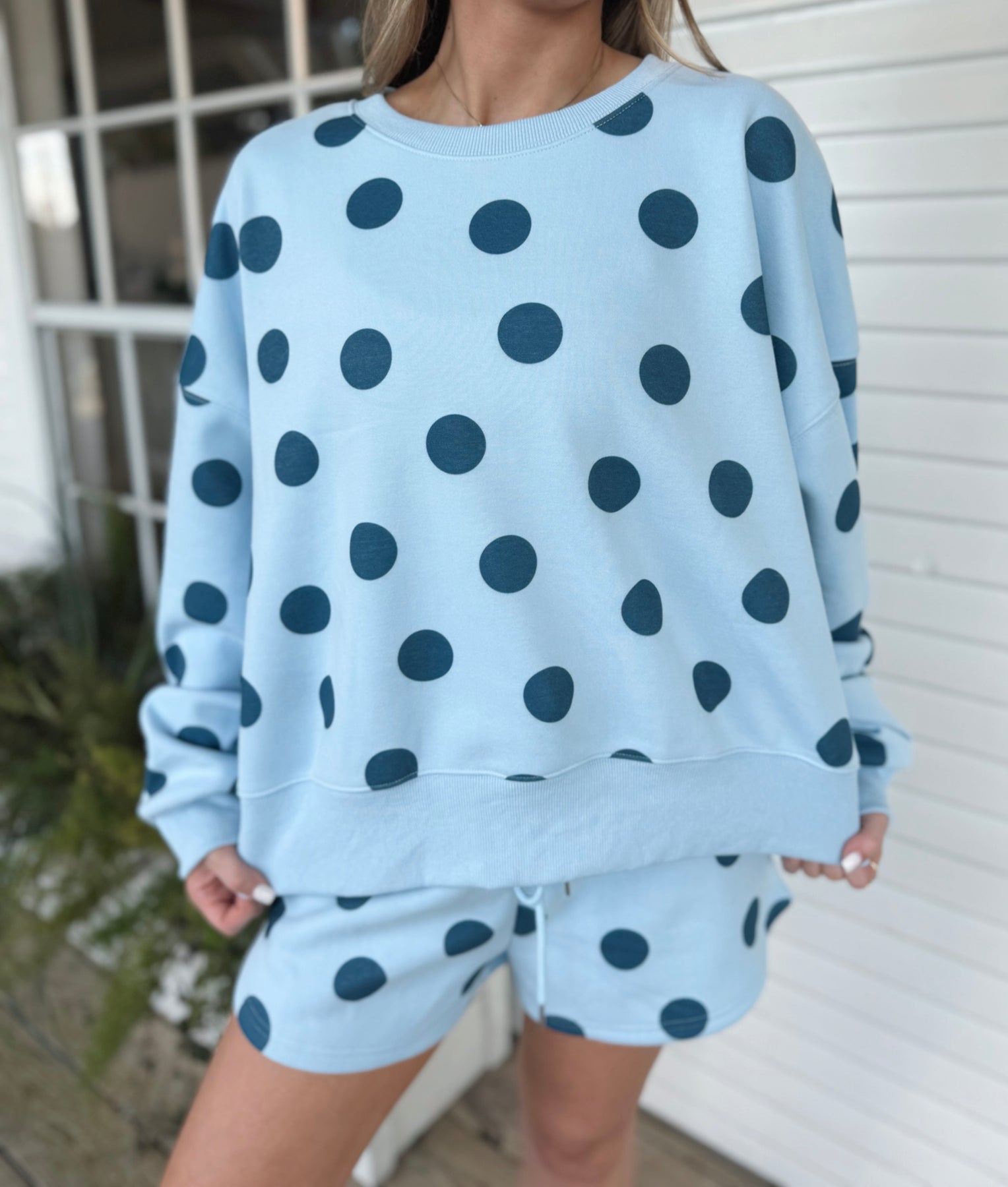 The Blue Polka Dot Sweatshirt features a light blue base adorned with navy polka dots, combining aesthetic appeal with comfort. This design offers a versatile option suitable for various casual settings. The blend of colors can complement a range of outfits, providing both style and practicality.