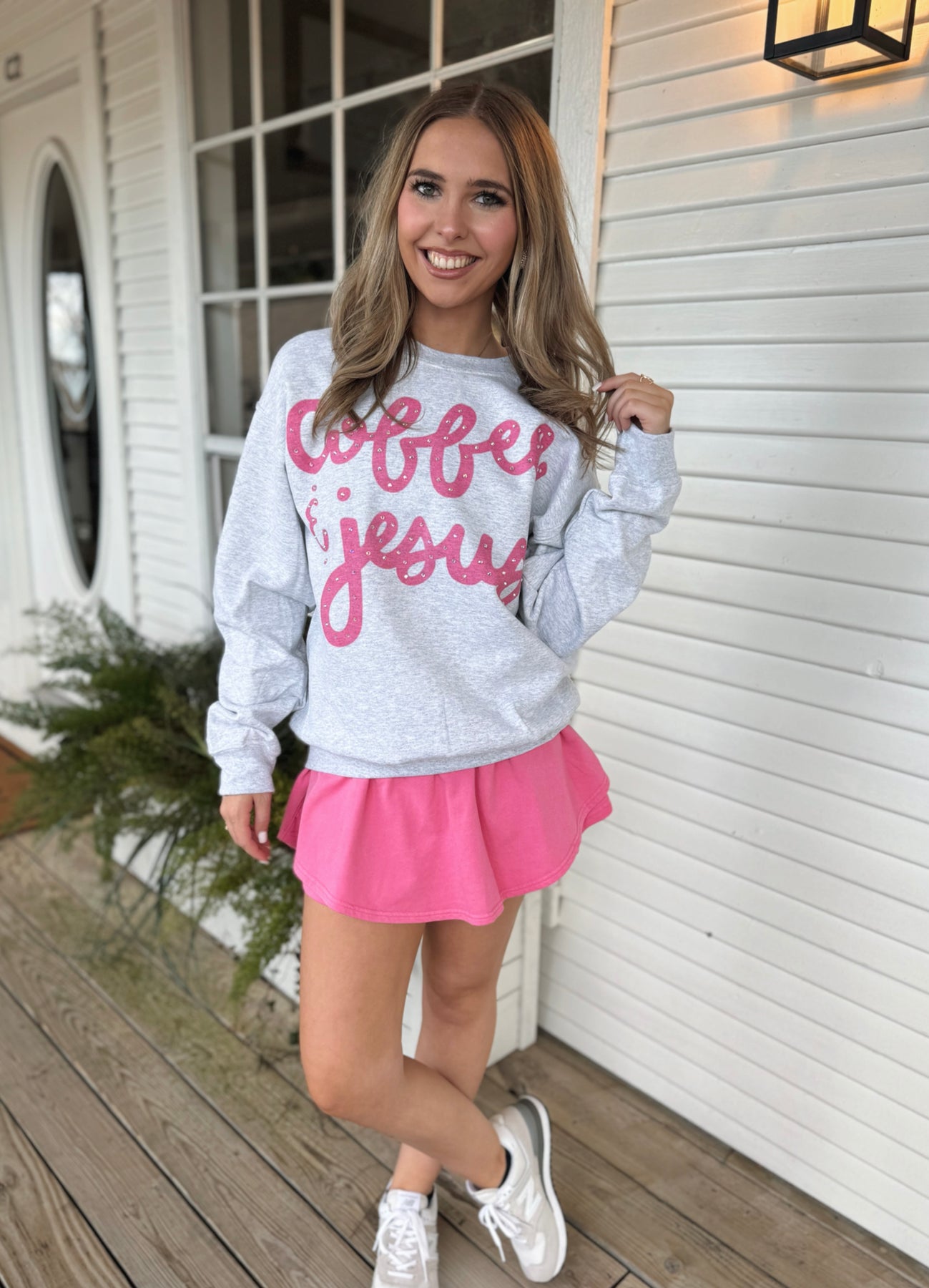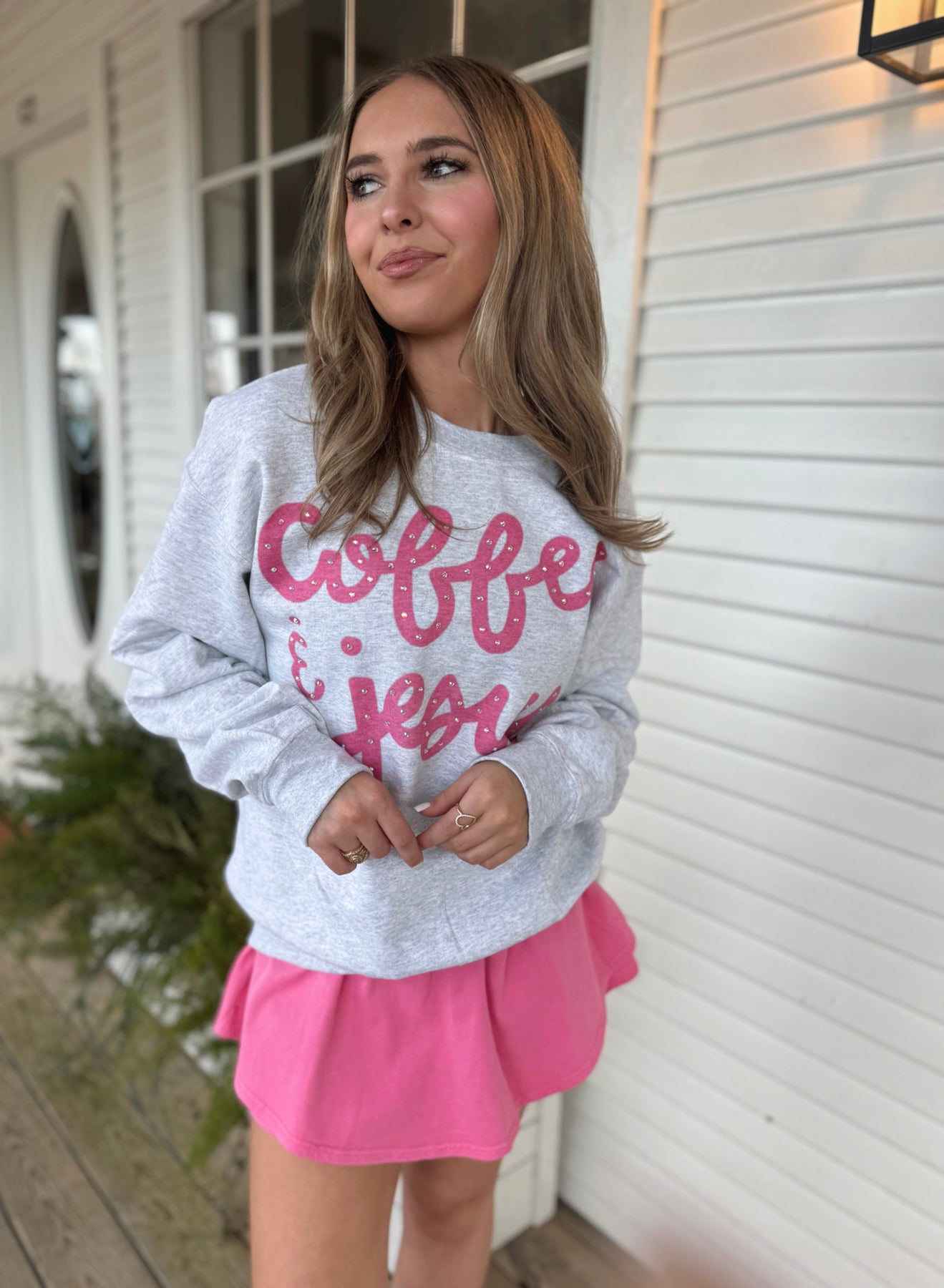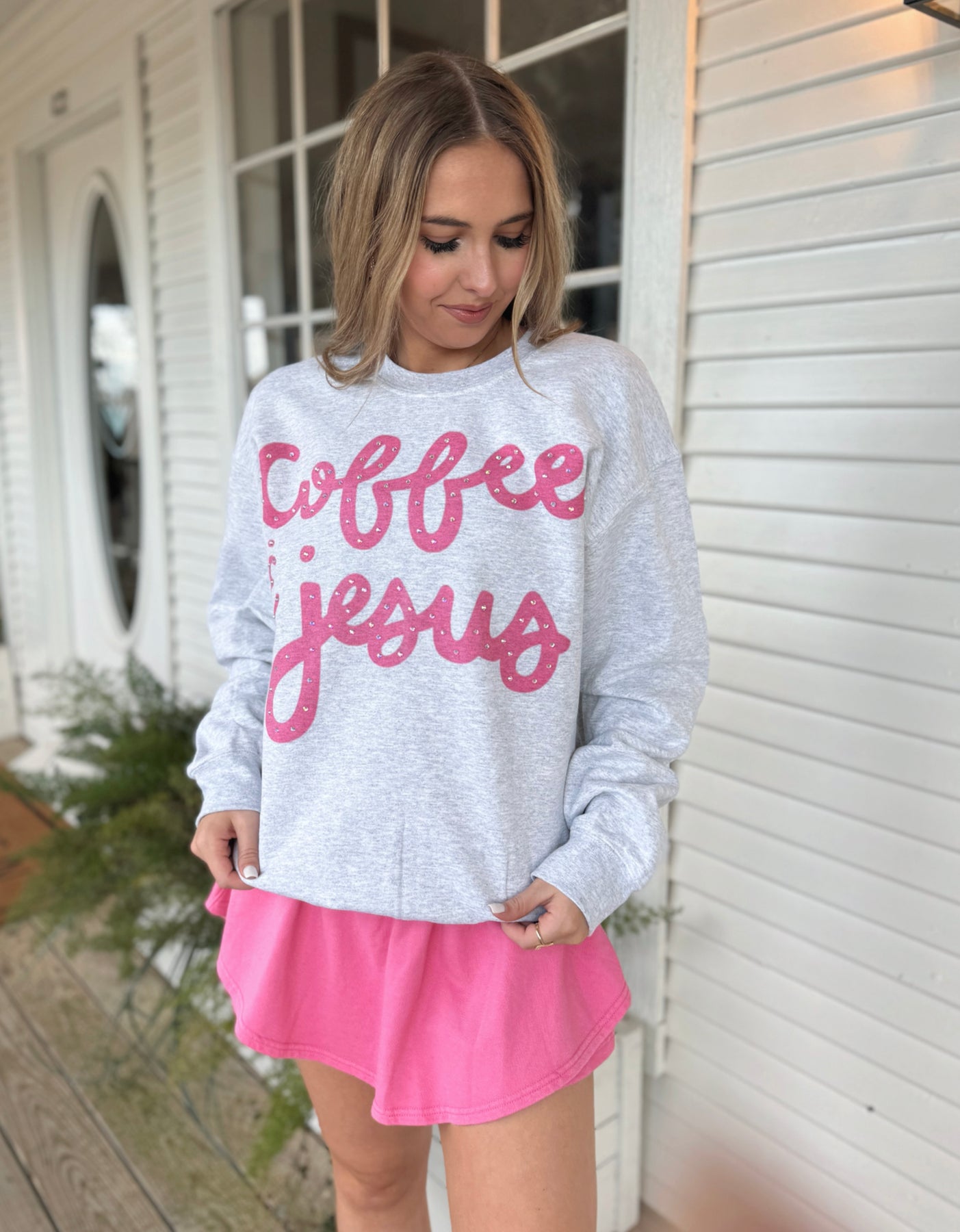 The Coffee & Jesus Sweatshirt features a rhinestoned print that combines aesthetic appeal with a faith-based message. Crafted from high-quality materials, it offers comfort and durability, making it a suitable choice for both casual wear and relaxed settings. Its unique design ensures a distinctive look while embodying a personal statement of faith.